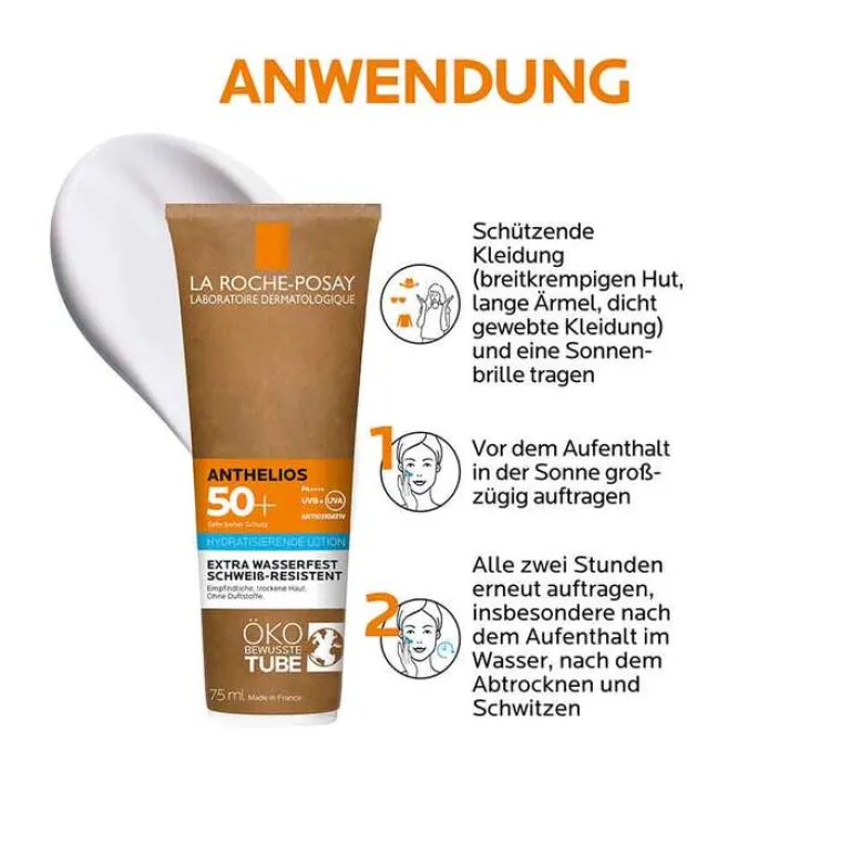 Die Roche Posay Anthelios hydratisierende Milch LSF 50+ unmittelbar vor dem Aufenthalt in der Sonne auf den Körper auftragen und gründlich verteilen.