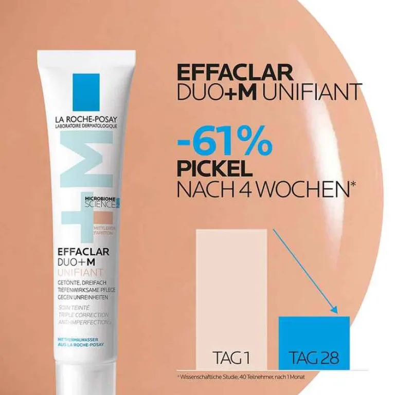 Die dreifach korrigierende getönte Gesichtspflege für fettige und zu Akne neigende Haut, basiert auf den Erkenntnissen der Mikrobiom-Wissenschaft. Effaclar Duo+M deckt Hautunreinheiten ab und vereinheitlicht den Teint. Die Creme korrigiert Hautunreinheiten, lässt Pickelmale verblassen. Sie verfügt über eine leichte Deckungskraft für den ganzen Tag.
