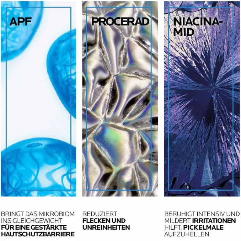 Die Feuchtigkeitspflege von La Roche Posay enthält zum einen das Prebiotikum Orellana Extrakt, welches unreine Haut mildert und zugleich die Feuchtigkeit für bis zu 48h bewahrt. Zum anderen beinhaltet die Formel Procerad und Provitamin B5 sowie Aqua Posae Filiformis, wodurch das Mikrobiom und die geschwächte Hautbarriere gestärkt werden.