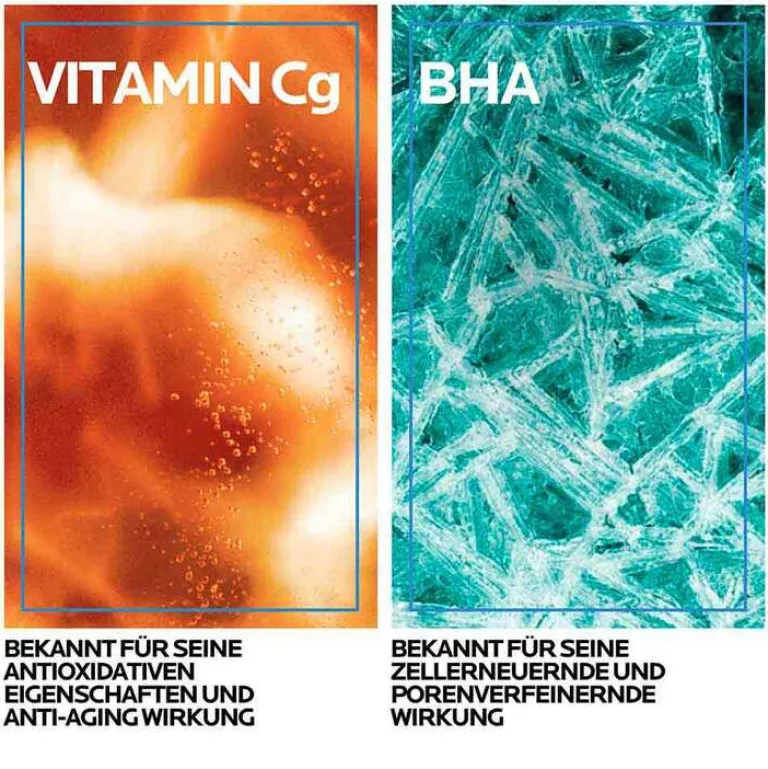 Die hautglättende und feuchtigkeitsspendende Formel enthält zum einen Vitamin C, welches für seine antioxidative und Anti-Aging-Wirkung bekannt ist sowie zum anderen BHA. Dieser Inhaltsstoff wirkt exfolierend, befreit die Poren und regt die Hauterneuerung an. Thermalwasser aus La Roche-Posay ist ebenfalls Bestandteil der Gesichtsreinigung mit schäumender Gel-Textur.