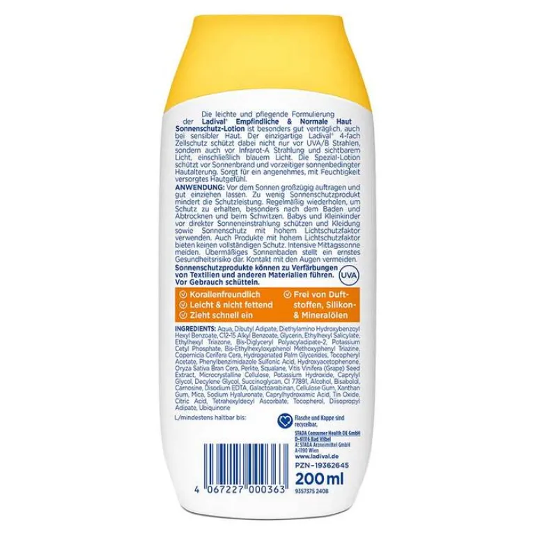 Sonnenstrahlen gibt es in verschiedenen Wellenlängen. Sie haben verschiedene Auswirkungen auf die Haut, wirken jedoch alle zellschädigend. Daher ist es wichtig einen Sonnenschutz zu verwenden, der rundum schützt. Dank einzigartigem 4-fach Zellschutz schützt die Ladival® Empfindliche & Normale Haut Sonnenschutz-Lotion vor UV-A- und UV-B-Strahlen, vor den Folgen der Infrarot-A-Strahlung und sichtbarem Licht (einschließlich blauem Licht). So wird die Haut auch vor einer vorzeitigen, sonnenbedingten Hautalterung geschützt.