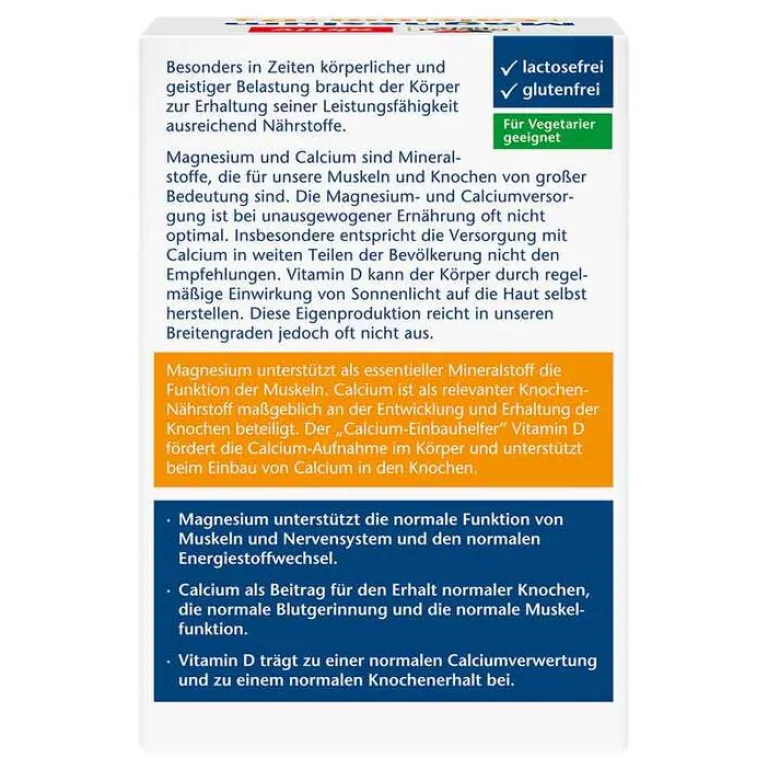 Besonders in Zeiten körperlicher und geistiger Belastung braucht der Körper zur Erhaltung seiner Leistungsfähigkeit ausreichend Nährstoffe. Magnesium und Calcium sind Mineralstoffe, die für unsere Muskeln und Knochen von großer Bedeutung sind.* Die Magnesium- und Calciumversorgung ist bei unausgewogener Ernährung oft nicht optimal. Insbesondere entspricht die Versorgung mit Calcium in weiten Teilen der Bevölkerung nicht den Empfehlungen. Vitamin D kann der Körper durch regelmäßige Einwirkung von Sonnenlicht auf die Haut selbst herstellen. Diese Eigenproduktion reicht in unseren Breitengraden jedoch oft nicht aus. Magnesium unterstützt die normale Funktion von Muskeln und Nervensystem und den normalen Energiestoffwechsel.* Calcium als Beitrag für den Erhalt normaler Knochen, die normale Blutgerinnung und die normale Muskelfunktion.* Vitamin D trägt zu einer normalen Calciumverwertung und zu einem normalen Knochenerhalt bei.*