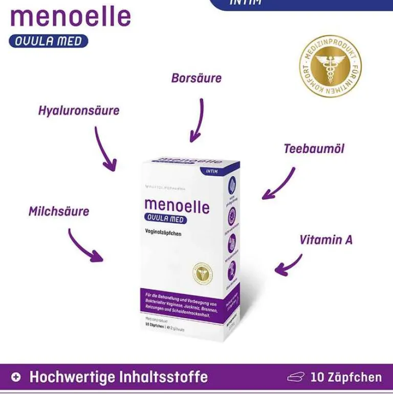 Menoelle Ovula med ist ein Medizinprodukt, das die Erhaltung der natürlichen Abwehrkräfte der Vagina unterstützt und die Erholung der Vaginalflora fördert. Hyaluronsäure, Borsäure und Milchsäure helfen dabei, Symptome von Scheidentrockenheit und/oder einen aus dem Gleichgewicht geratenen pH-Wert zu kurieren.