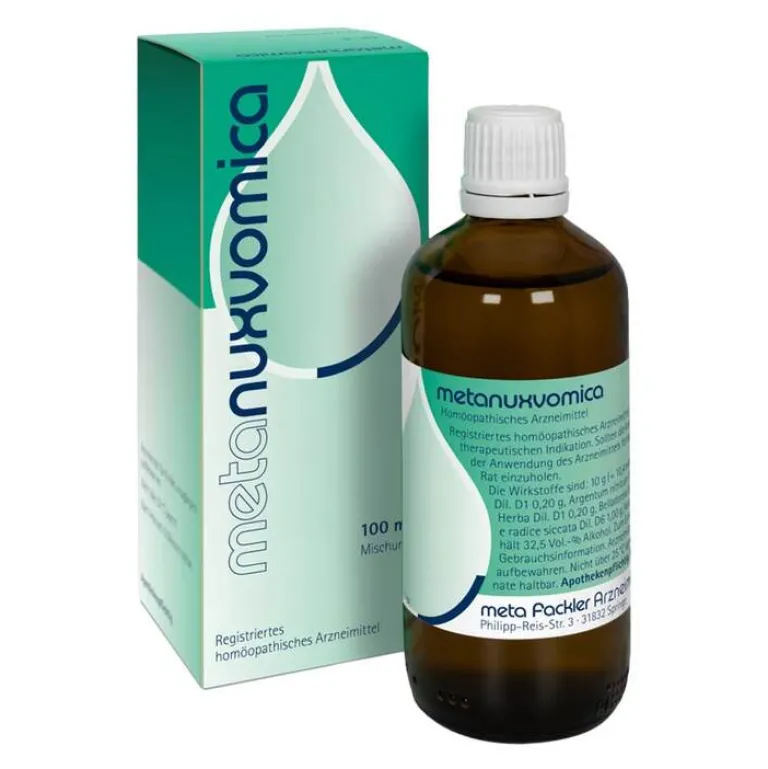 metanuxvomica Mischung.Anwendungsgebiete: Registriertes homöopathisches Arzneimittel, daher ohne Angabe einer therapeutischen Indikation. Enthält 37 mg Alkohol (Ethanol) pro 5 Tropfen, entsprechend 32,5 Vol.-%. Zu Risiken und Nebenwirkungen lesen Sie die Packungsbeilage und fragen Sie Ihre Ärztin, Ihren Arzt oder in Ihrer Apotheke. meta Fackler Arzneimittel GmbH, D-31832 Springe.