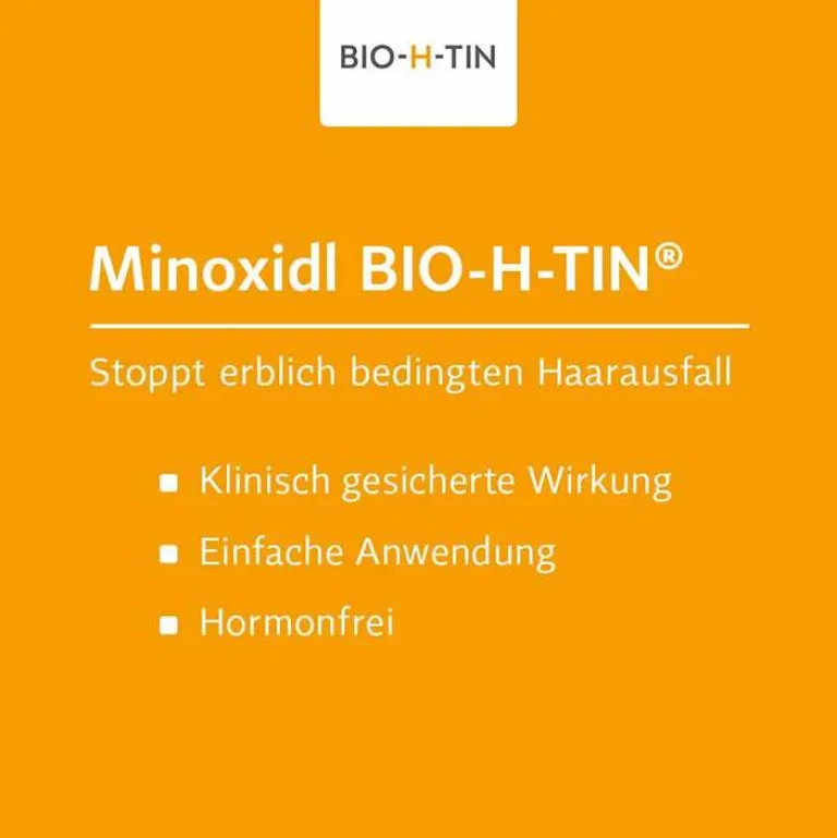 Minoxidil BIO-H-TIN-Pharma stoppt den Haarausfall und fördert das Nachwachsen der Haare an bereits gelichteten Stellen. Das Vitamin H (Biotin) unterstützt das gesunde und kräftige Wachstum Ihrer Haare und bietet somit eine gute Ergänzung zur Therapie mit Minoxidil BIO-H-TIN-Pharma.
