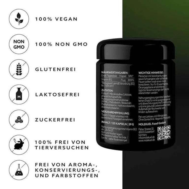 Das Molekuel Vitamin B12-Komplex wurde in Deutschland zusammen mit Experten nach höchsten Standards entwickelt. Die ausgewogene Kombination des Coenzyms aus drei verschiedenen Cobalaminen liefert Ihnen 75 µg Vitamin B12 pro Tagesdosis (1 Kapsel). Mit jedem Produkt erhalten Sie einen 4-Monatsvorrat (120 Kapseln).