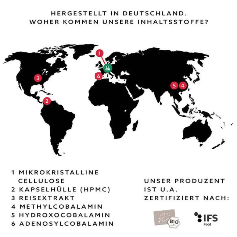 Füllstoff: Mikrokristalline Cellulose, pflanzliche Kapselhülle: Hydroxypropylmethylcellulose (HPMC), Maltodextrin, Reisextrakt, Methylcobalamin, Hydroxocobalamin, Adenosylcobalamin.