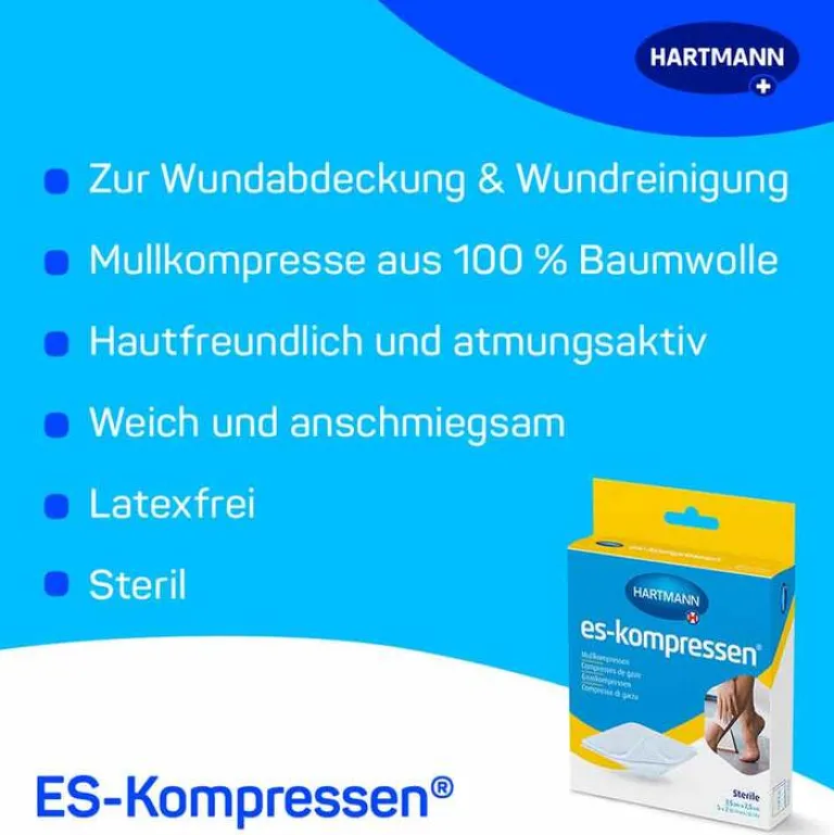 Darüber hinaus glänzt die ES-Kompresse mit ihrer Flexibilität: Sie kann als Wundabdeckung, Trägermaterial für Salben oder als polsternde Unterstützung in der Wundversorgung dienen. Vertrauen Sie auf HARTMANN, um auch in unerwarteten Situationen bestens vorbereitet zu sein.