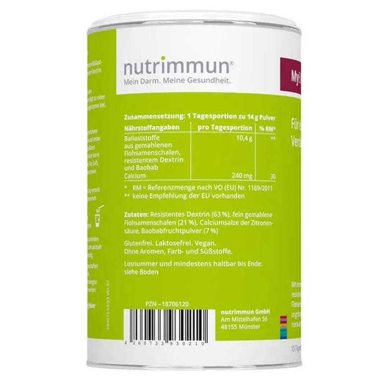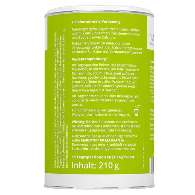 - Nahrungsergänzungsmittel mit einem Ballaststoffmix aus Flohsamenschalen, resistentem Dextrin, Baobab und Calcium