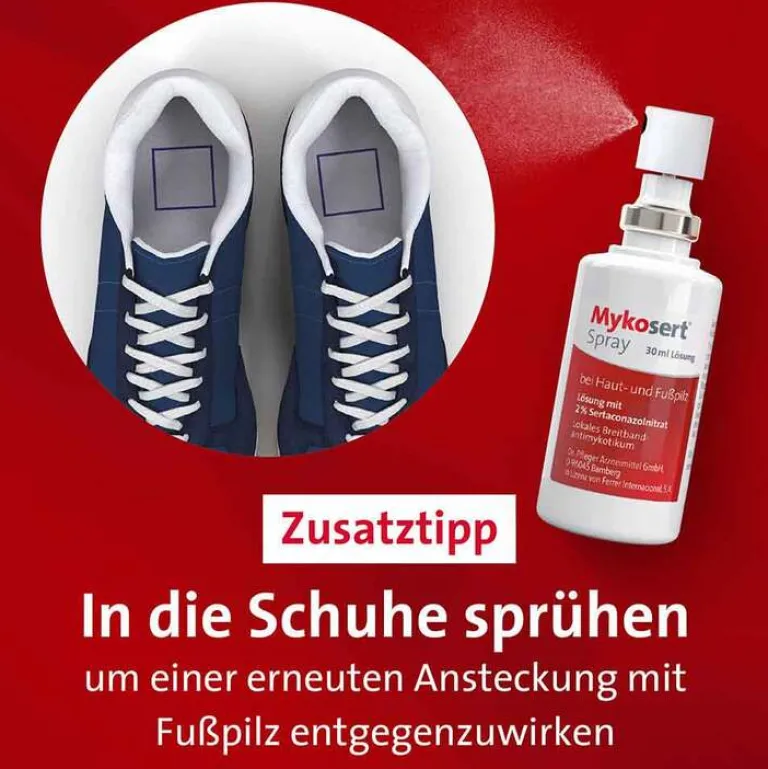 Mykosert® Spray bei Haut- und Fußpilz Lösung mit 2 % Sertaconazolnitrat. Wirkstoff: Sertaconazolnitrat. Anw.: Pityriasis versicolor sowie b. Pilzinfekt. der Haut, die durch Dermatophyten verursacht werden (z.B. Fußpilz). Enth.: Propylenglycol u. Glycerinformal. Gebrauchsinfo. beachten. Zu Risiken und Nebenwirkungen lesen Sie die Packungsbeilage und fragen Sie Ihre Ärztin, Ihren Arzt oder in Ihrer Apotheke. (MKL/201218/LW)