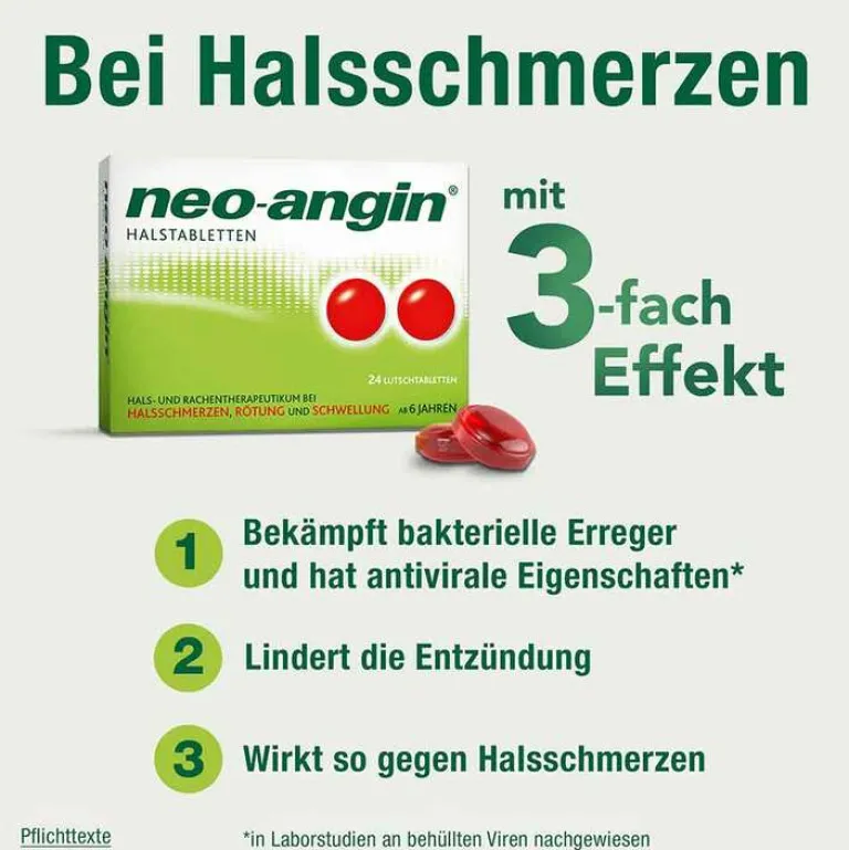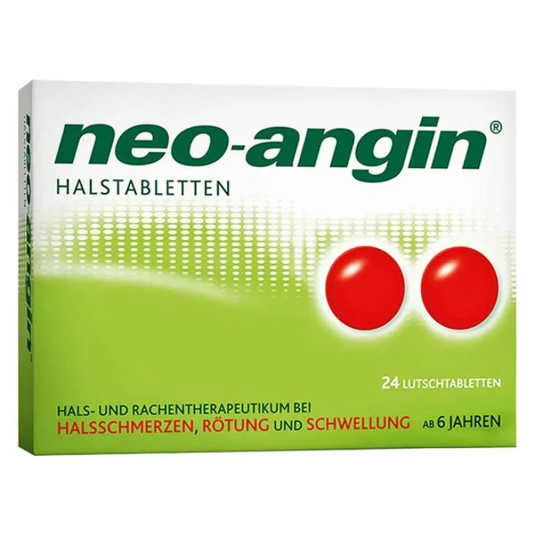 neo-angin® Halstabletten. Anwendungsgebiet: Zur unterstützenden Behandlung bei Entzündungen der Rachenschleimhaut, die mit typischen Symptomen wie Halsschmerzen, Rötung oder Schwellung einhergehen. Zur Anwendung bei Erwachsenen und Kindern ab 6 Jahren. Wenn Sie sich nach 3 – 4 Tagen nicht besser oder gar schlechter fühlt, sollten Sie sich an Ihren Arzt wenden. Bitte Packungsbeilage beachten. Zu Risiken und Nebenwirkungen lesen Sie die Packungsbeilage und fragen Sie Ihre Ärztin, Ihren Arzt oder in Ihrer Apotheke.