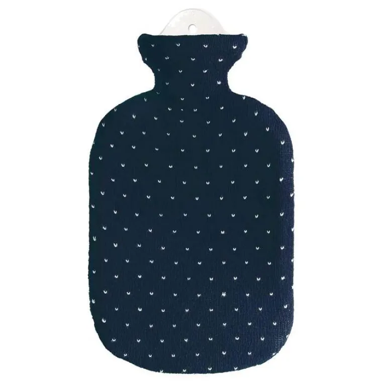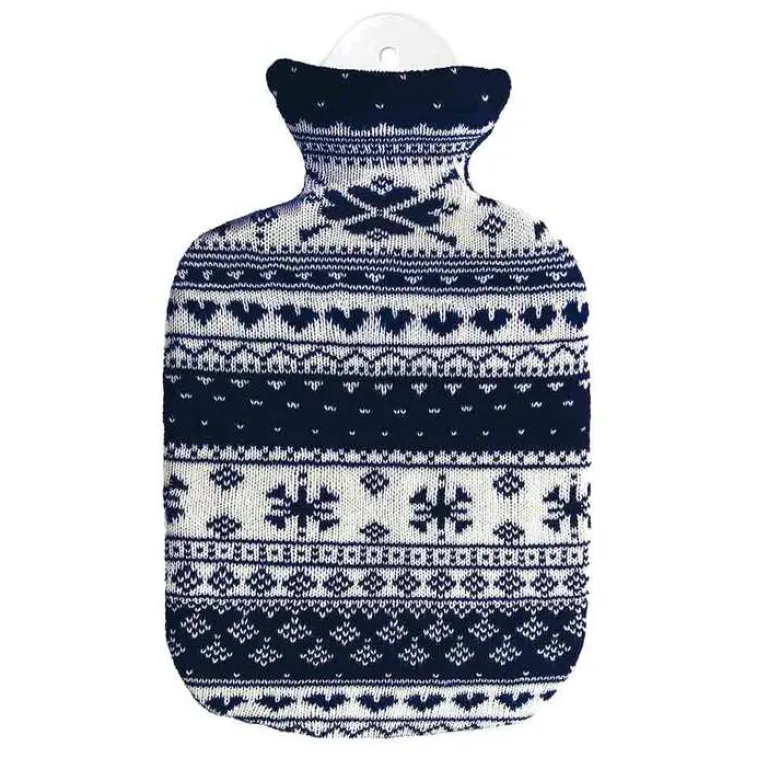 Die hübsche Natur-Gummiwärmflasche verfügt über einen schönen Strickbezug mit Norwegermuster. Die Rückseite unterscheidet sich vom Muster her von der Vorderseite. Beide Seiten sind mit dunkelblau-weißen Akzenten im Norweger-Stil gestrickt. Der Bezug ist mit einem Reißverschluss ausgestattet. Das Material des hübschen Strickbezuges entspricht dem Oeko-Tex Standard 100. Im Lieferumfang ist sowohl der Bezug als auch die 2,0 Liter Gummi-Wärmflasche enthalten.