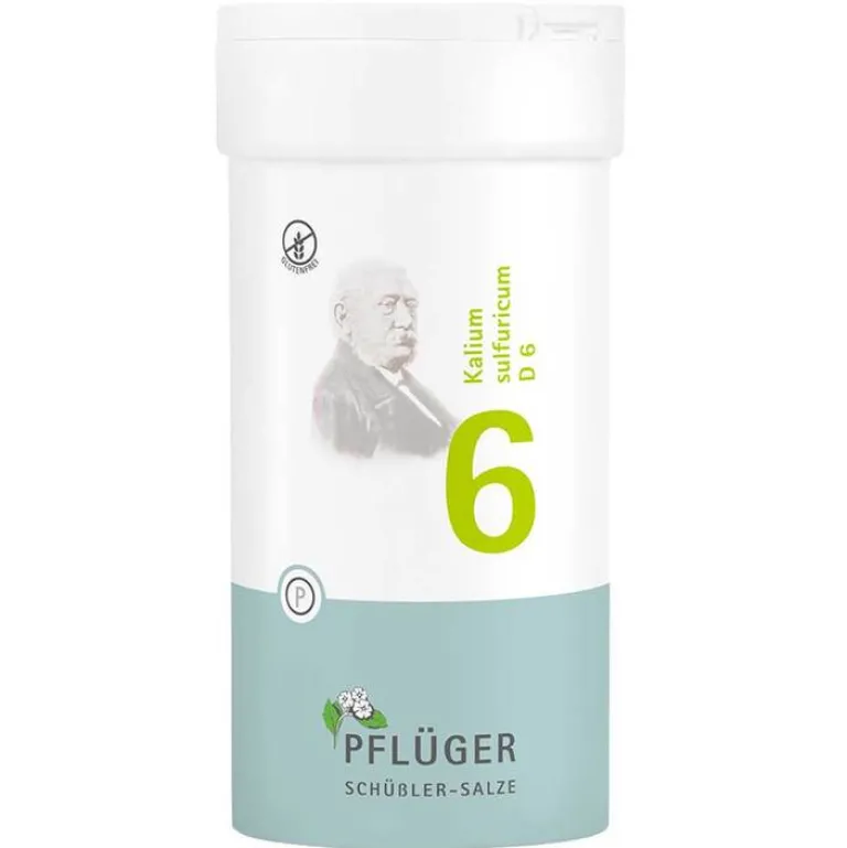 Biochemie Pflüger® Nr. 6 Kalium sulfuricum D 6, Zusammensetzung: 1 Tablette enthält: Wirkstoff: Kalium sulfuricum D 6 250 mg. Sonstige Bestandteile: Calciumbehenat (DAB), Kartoffelstärke. Registriertes homöopathisches Arzneimittel, daher ohne Angabe einer therapeutischen Indikation. Gegenanzeigen/Nebenwirkungen: keine bekannt. Enthält Lactose. Packungsbeilage beachten. Zu Risiken und Nebenwirkungen lesen Sie die Packungsbeilage und fragen Sie Ihre Ärztin, Ihren Arzt oder in Ihrer Apotheke. Homöopathisches Laboratorium Alexander Pflüger GmbH & Co. KG, 33378 Rheda-Wiedenbrück | [email protected] | www.pflueger.de