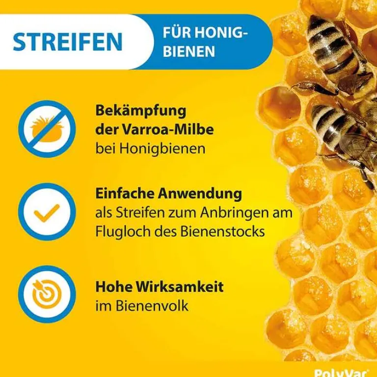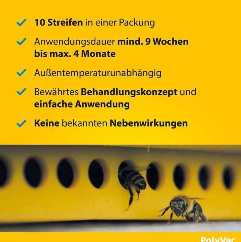 In der Imkerei stellt die Varroa-Milbe eine ernsthafte Bedrohung für Bienenvölker dar. Die PolyVar® YELLOW Bienenschleuse ist ein effektives und zugelassenes Tierarzneimittel zur Bekämpfung von Varroa destructor Milben bei Honigbienen. Der imprägnierte Streifen wird direkt am Flugloch des Bienenstocks befestigt und bleibt dort mindestens 9 Wochen bzw. bis zum Ende der Flugaktivität. Die Bienen haben beim Einfliegen Kontakt mit dem imprägnierten Streifen, nehmen den Wirkstoff oberflächlich auf und verteilen ihn durch soziale Interaktion innerhalb des Volkes.