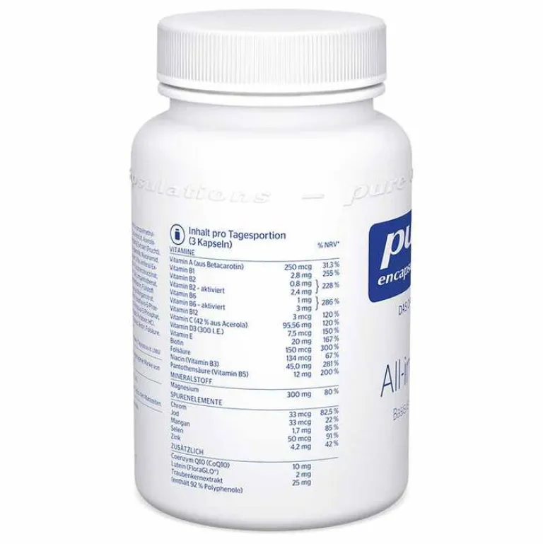 All-in-one von Pure Encapsulations liefert Nährstoffe für die tägliche Versorgung und enthält zusätzlich CoQ10, Lutein und Polyphenole aus Traubenkerextrakt. Die wissenschaftlich fundierte Rezeptur gewährleistet eine gute Aufnahme im Körper und ist sehr gut geeignet, um die Ernährung zu ergänzen.