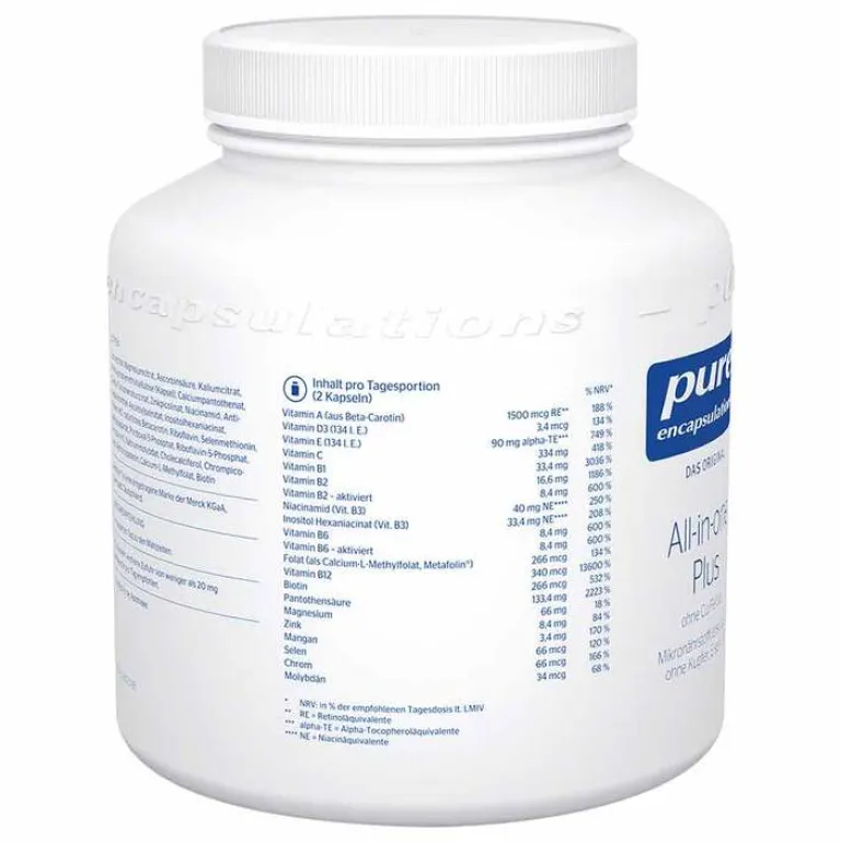 All-in-one Plus (ohne Cu/Fe/Jod) von Pure Encapsulations beinhaltet ein umfangreiches Spektrum an Vitaminen und Mineralstoffen.*