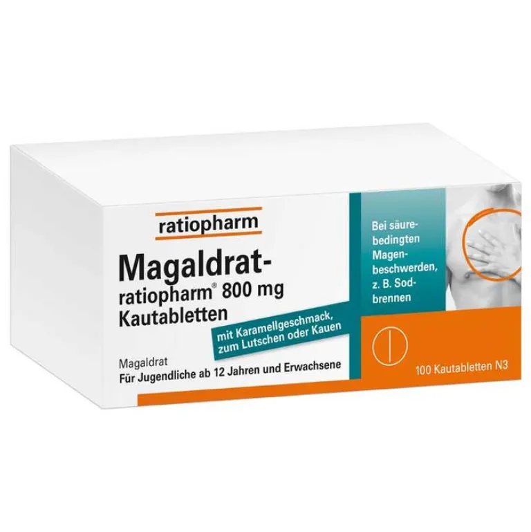 Magaldrat-ratiopharm® 800 mg Kautabletten. Wirkstoff: Magaldrat. Anwendungsgebiete: Sodbrennen und säurebedingte Magenbeschwerden. Warnhinweis: AM enth. Sorbitol! Apothekenpflichtig. Zu Risiken und Nebenwirkungen lesen Sie die Packungsbeilage und fragen Sie Ihre Ärztin, Ihren Arzt oder in Ihrer Apotheke. 9/21.