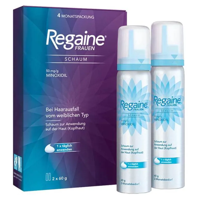 Regaine® Frauen Schaum. Wirkstoff: Minoxidil. Anwendungsgebiete: Regaine® Frauen Schaum stabilisiert bei Frauen den Verlauf der androgenetischen Alopezie vom weiblichen Typ (charakteristische anlagebedingte diffuse Kopfhaarverdünnung im Scheitelbereich). Die Behandlung mit Regaine® Frauen Schaum fördert das Haarwachstum u. kann so dem Fortschreiten dieses Haarverlustes entgegenwirken. Zu Risiken und Nebenwirkungen lesen Sie die Packungsbeilage und fragen Sie Ihre Ärztin, Ihren Arzt oder in Ihrer Apotheke. Johnson & Johnson GmbH, 41470 Neuss. Stand: 07/2023