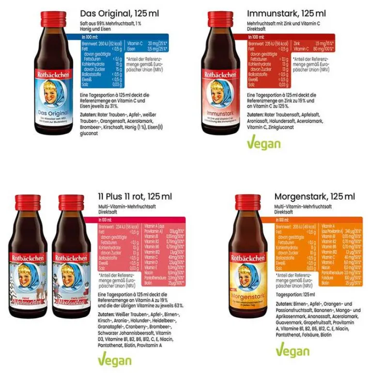 Rotbäckchen 11 und 11 rot: Weißer Trauben-, Apfel-, Birnen-, Kirsch-, Aronia-, Holunder-, Heidelbeer-, Granatapfel-, Cranberry-, Brombeer-, Schwarzer Johannisbeersaft, Vitamin D3, Vitamine B1, B2, B6, B12, C, E, Niacin, Pantothenat, Biotin, Provitamin A