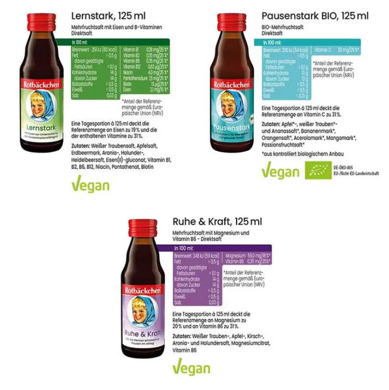 Rotbäckchen Lernstark: Weißer Traubensaft, Apfelsaft, Erdbeermark, Aronia-, Holunder-, Heidelbeersaft, Eisen(II)-gluconat, Vitamin B1, B2, B6, B12, Niacin, Pantothenat, Biotin.