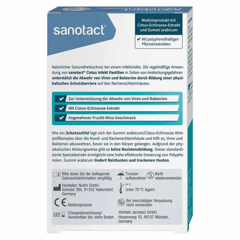 Die sanotact® Cistus Infekt Pastillen die Inhaltstoffe legen sich wie ein Schutzschild über die Mund- und Rachenschleimhäute. Diese Barriere dient zur Unterstützung der physikalischen Abwehr von Viren und Bakterien und kann so deren Eindringen in die Körperzellen verhindern.