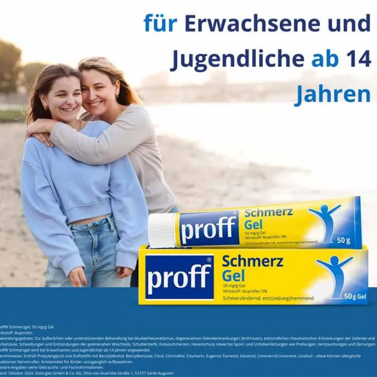 proff® Schmerzgel, 50 mg/g Gel Wirkstoff: Ibuprofen Anwendungsgebiete: Zur äußerlichen oder unterstützenden Behandlung bei Muskelrheumatismus, degenerativen Gelenkerkrankungen (Arthrosen), entzündlichen rheumatischen Erkrankungen der Gelenke und Wirbelsäule, Schwellungen und Entzündungen der gelenknahen Weichteile, Schultersteife, Kreuzschmerzen, Hexenschuss sowie bei Sport- und Unfallverletzungen wie Prellungen, Verstauchungen und Zerrungen. proff® Schmerzgel wird bei Erwachsenen und Jugendlichen ab 14 Jahren angewendet. Warnhinweise: Enthält Propylenglycol und Duftstoffe mit Benzylalkohol, Benzylbenzoat, Citral, Citronellol, Coumarin, Eugenol, Farnesol, Geraniol, Limonen/d-Limonene, Linalool – diese können allergische Reaktionen hervorrufen. Arzneimittel für Kinder unzugänglich aufbewahren. Weitere Angaben siehe Gebrauchs- und Fachinformationen. Stand: Oktober 2024. Dolorgiet GmbH & Co. KG, Otto-von-Guericke-Straße 1, 53757 Sankt Augustin Zu Risiken und Nebenwirkungen lesen Sie die Packungsbeilage und fragen Sie Ihre Ärztin, Ihren Arzt oder Ihre Apotheke.