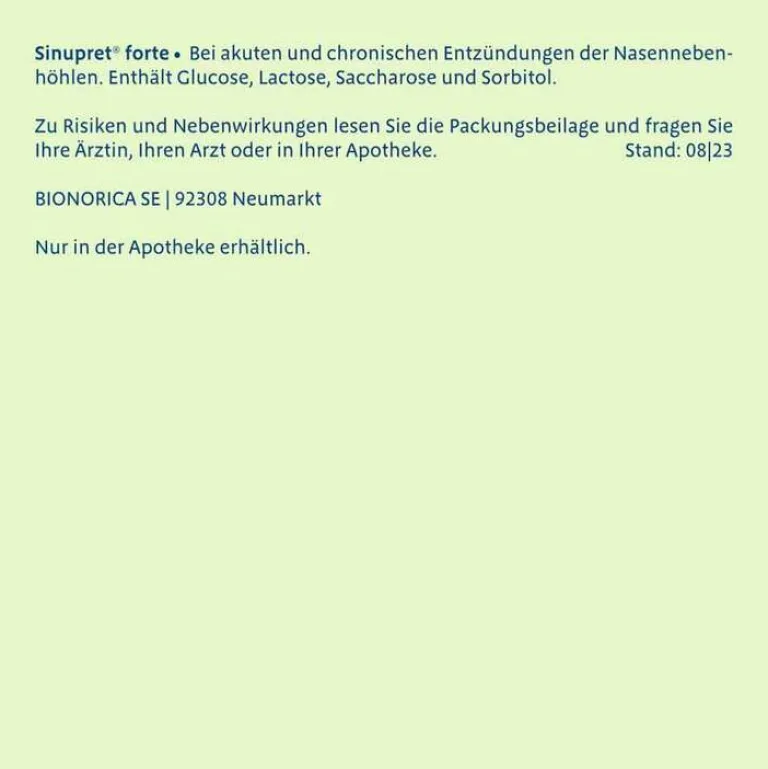 Sinupret® forte. Bei akuten und chronischen Entzündungen der Nasennebenhöhlen. Enthält Glucose, Lactose, Saccharose und Sorbitol. Zu Risiken und Nebenwirkungen lesen Sie die Packungsbeilage und fragen Sie Ihre Ärztin, Ihren Arzt oder in Ihrer Apotheke. Stand 08/23