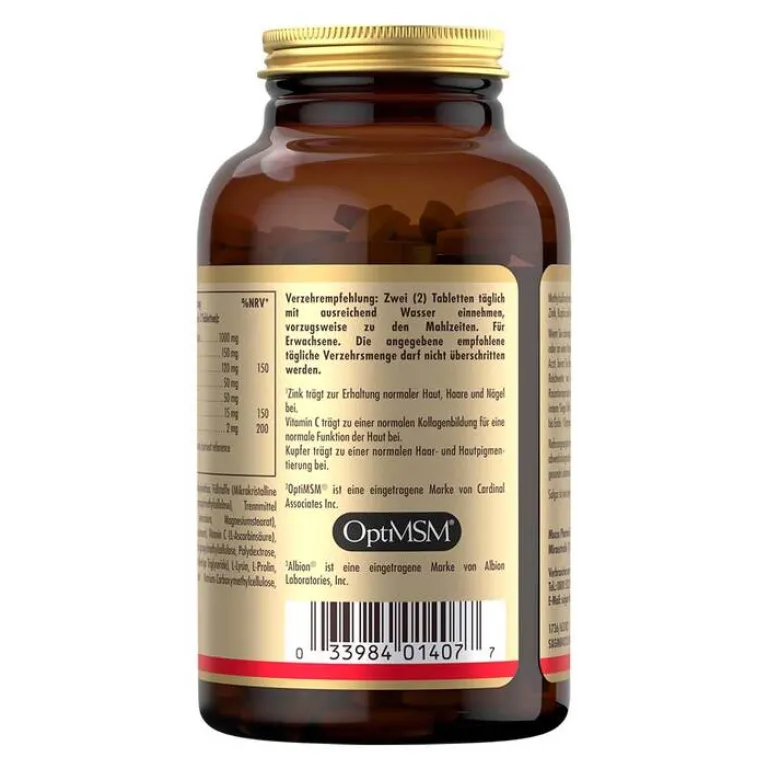- Nahrungsergänzungsmittel mit MSM, Rotalge, Vitamin C, L-Lysin, L-Prolin, Zink und Kupfer