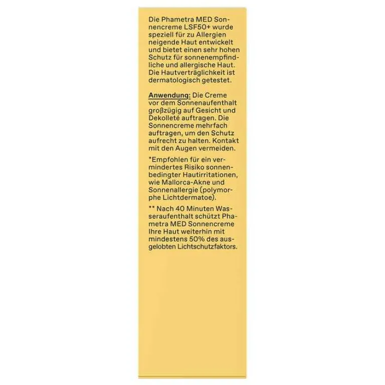 Die Phametra Med Sonnencreme LSF 50 + ist wasserfest: Nach 40 Minuten Wasseraufenthalt schützt die Sonnencreme LSF 50+ Ihre Haut weiterhin mit mindestens 50% des ausgelobten Lichtschutzfaktors.