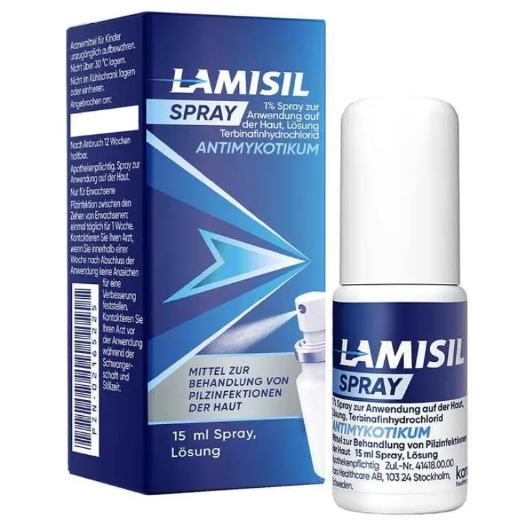 LAMISIL Spray 1 % Spray zur Anwendung auf der Haut, Lösung Wirkstoff: Terbinafinhydrochlorid Anwendungsgebiete: LAMISIL Spray wird angewendet bei Pilzinfektionen der Haut an den Füßen, im Leistenbereich, am Körper sowie bei Kleinepilzflechte (Pityriasis versicolor). Stand: 11/2023. Zu Risiken und Nebenwirkungen lesen Sie die Packungsbeilage und fragen Sie Ihre Ärztin, Ihren Arzt oder in Ihrer Apotheke.