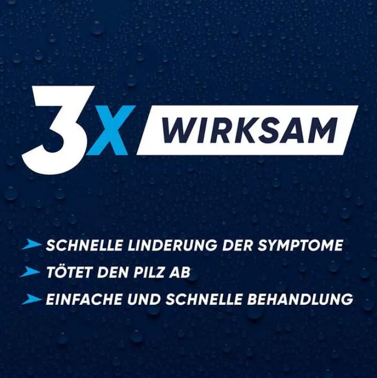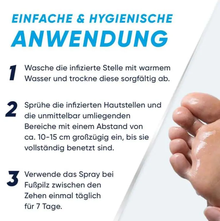 - Schnelle und einfache Anwendung: Waschen Sie die infizierten Stellen mit warmem Seifenwasser und trocknen Sie diese gründlich ab. Sprühen Sie eine dünne Schicht des Sprays auf die infizierten Stellen und die angrenzenden Bereiche auf. Bei Fußpilz zwischen den Zehen einmal täglich über einen Zeitraum von 7 Tagen auftragen.