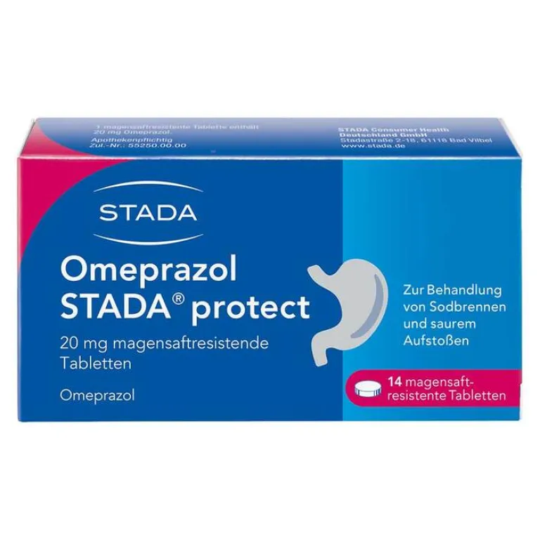 Omeprazol STADA® protect 20 mg magensaftresistente Tabletten. Wirkstoff: Omeprazol. Zur kurzzeitigen Behandlung von Refluxbeschwerden (z.B. Sodbrennen, Säurerückfluss) bei Erwachsenen. Reflux ist der Rückfluss von Säure aus dem Magen in die Speiseröhre, die sich entzünden und Schmerzen verursachen kann. Dadurch kann es bei Ihnen zu Krankheitsanzeichen wie einem bis zum Rachen aufsteigenden brennenden Schmerz in der Brust (Sodbrennen) und einem sauren Geschmack im Mund (Säurerückfluss) kommen. Es kann notwendig sein, Omeprazol STADA® protect 2 – 3 aufeinander folgende Tage einzunehmen, um eine Besserung der Beschwerden zu erreichen. Hinweis: Enthält Lactose. Zu Risiken und Nebenwirkungen lesen Sie die Packungsbeilage und fragen Sie Ihre Ärztin, Ihren Arzt oder in Ihrer Apotheke. STADA Consumer Health Deutschland GmbH, Stadastraße 2-18, 61118 Bad Vilbel Stand: Februar 2023
