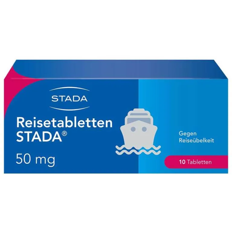 Reisetabletten STADA® 50 mg Wirkstoff: Dimenhydrinat. Zur Vorbeugung und Behandlung von Reisekrankheit, Schwindel, Übelkeit und Erbrechen (nicht bei Chemotherapie). Enthält Lactose. Zu Risiken und Nebenwirkungen lesen Sie bitte die Packungsbeilage und fragen Sie Ihren Arzt oder Apotheker. STADA Consumer Health Deutschland GmbH, Stadastraße 2–18, 61118 Bad Vilbel. Stand: Stand: November 2020