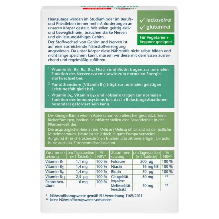 1,1 mg Vitamin B1, 1,4 mg Vitamin B2, 1,4 mg Vitamin B6, 2,5 µg Vitamin B12, 6 mg Pantothensäure, 200 µg Folsäure, 16 mg Niacin, 50 µg Biotin, 50 mg Ginkgoblätterextrakt, 40 mg Melissenblätterextrakt.