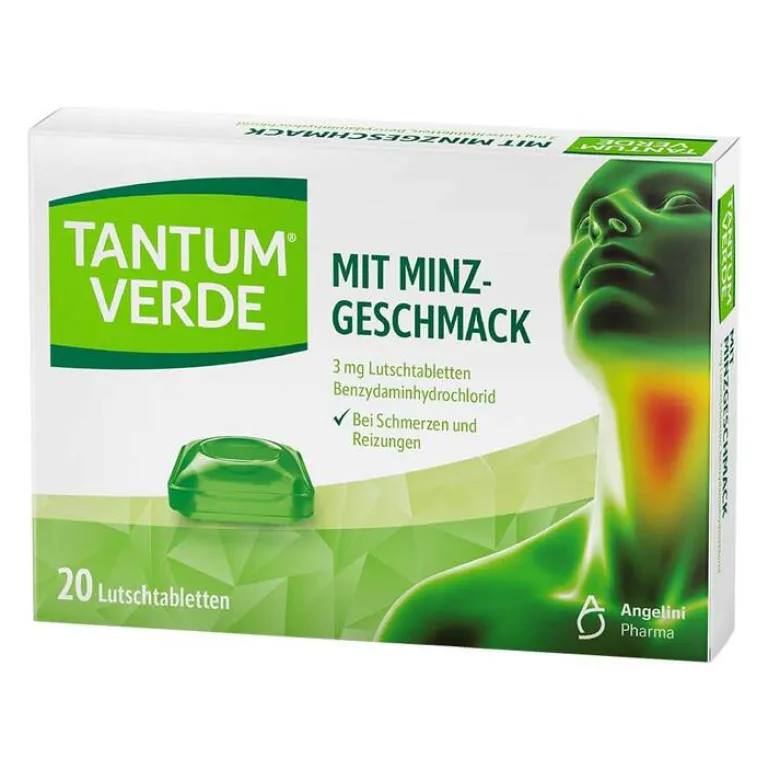 Tantum Verde® mit Minzgeschmack 3 mg Lutschtabletten Wirkstoff: Benzydaminhydrochlorid Anwendungsgebiet: Zur symptomatischen lokalen Behandlung von Schmerzen und Reizungen im Mund- und Rachenraum bei Erwachsenen und Kindern über 6 Jahren. Enthält Isomalt, Aspartam, Butylhydroxyanisol, Levomenthol, Minz- und Zitronen-Aroma. Zu Risiken und Nebenwirkungen lesen Sie die Packungsbeilage und fragen Sie Ihre Ärztin, Ihren Arzt oder in Ihrer Apotheke. Zulassungsinhaber: Angelini Pharma S.p.A, 00181 Rom, Italien. Stand der Information: Februar 2022