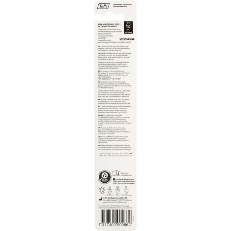 TePe Select Compact hat die gleichen Qualitäten wie die TePe Select, aber einen kleineren Bürstenkopf und ist sehr beliebt bei Kindern und Erwachsenen gleichermaßen, perfekt für kleine Münder und bei Neigung zu leichtem Würgreiz.