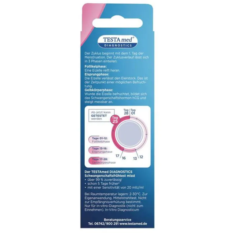 Der TESTAmed® DIAGNOSTICS Schwangerschafts Teststreifen weist das Hormon hCG schon ab einer Konzentration von 20 mIU/ml nach. Er ist 5 Tage vor dem Ausbleiben der Periode anwendbar1 und ab dem Tag der Fälligkeit über 99% zuverlässig. Der Test wurde nach dem 4. Internationalen Standard der WHO entwickelt.