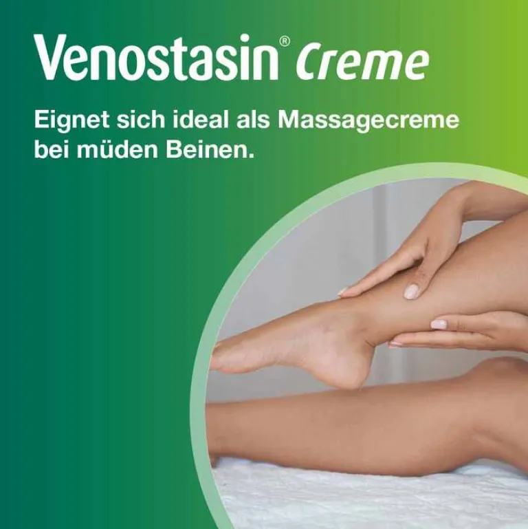 Venostasin® Creme: Wirkstoff: Rosskastaniensamen-Trockenextrakt. Anwendungsgebiet: Traditionelles pflanzl. Arzneimittel zur Anwend. bei Erwachsenen zur Besserung des Befindens bei müden Beinen ausschließlich auf Grund langjähriger Anwendung. Warnhinweise: Enthält u.a. Zimtaldehyd, Methyl-4-hydroxybenzoat (Ph.Eur.), Propyl-4-hydroxybenzoat (Ph.Eur.), Butylhydroxytoluol (Ph.Eur.), emulgierenden Cetylstearylalkohol (Typ A) (DAB), Polysorbat 65, Sorbinsäure (Ph.Eur.), Benzoesäure u. Benzoate. Arzneimittel f. Kinder unzugängl. aufbewahren. Stand: 03/22-2. Zu Risiken und Nebenwirkungen lesen Sie die Packungsbeilage und fragen Sie Ihre Ärztin, Ihren Arzt oder in Ihrer Apotheke.