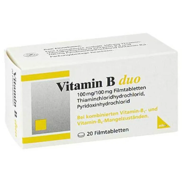Vitamin B Duo Filmtabletten. Anw.:zur Behandlung von neurologischen Systemerkrankungen durch nachgewiesenen Mangel der Vitamine B1 und B6. Zu Risiken und Nebenwirkungen lesen Sie die Packungsbeilage und fragen Sie Ihre Ärztin, Ihren Arzt oder in Ihrer Apotheke! MIBE GmbH Arzneimittel. Stand 2023
