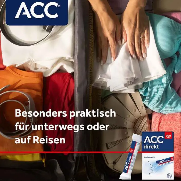 ACC® direkt 600 mg Pulver zum Einnehmen im Beutel, Wirkstoff: Acetylcystein. Anwendungsgebiet: Zur Schleimlösung und zum erleichterten Abhusten bei Atemwegserkrankungen mit zähem Schleim. Dieses Arzneimittel darf nur bei Erwachsenen und Jugendlichen ab 14 Jahre angewendet werden. Warnhinweis: Enthält Sorbitol und Aspartam. Nicht kauen. Zu Risiken und Nebenwirkungen lesen Sie die Packungsbeilage und fragen Sie Ihre Ärztin, Ihren Arzt oder in Ihrer Apotheke! Mat.-Nr.: 2/51016573 Stand: April 2024 Hexal AG, 83607 Holzkirchen, www.hexal.de