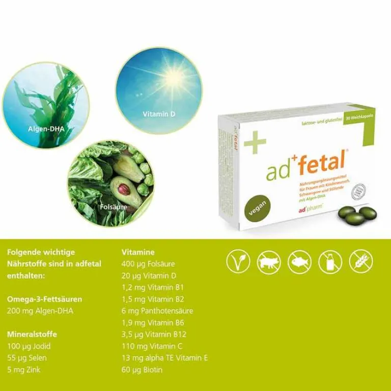* Adfetal beinhaltet wichtige Nährstoffe, die das Bundeszentrum für Ernährung in seiner Handlungsempfehlung 2018 und die Deutsche Gesellschaft für Ernährung empfehlen. Dies schließt Folsäure, DHA, Jodid und Eisen (nur bei Bedarf) mit ein.