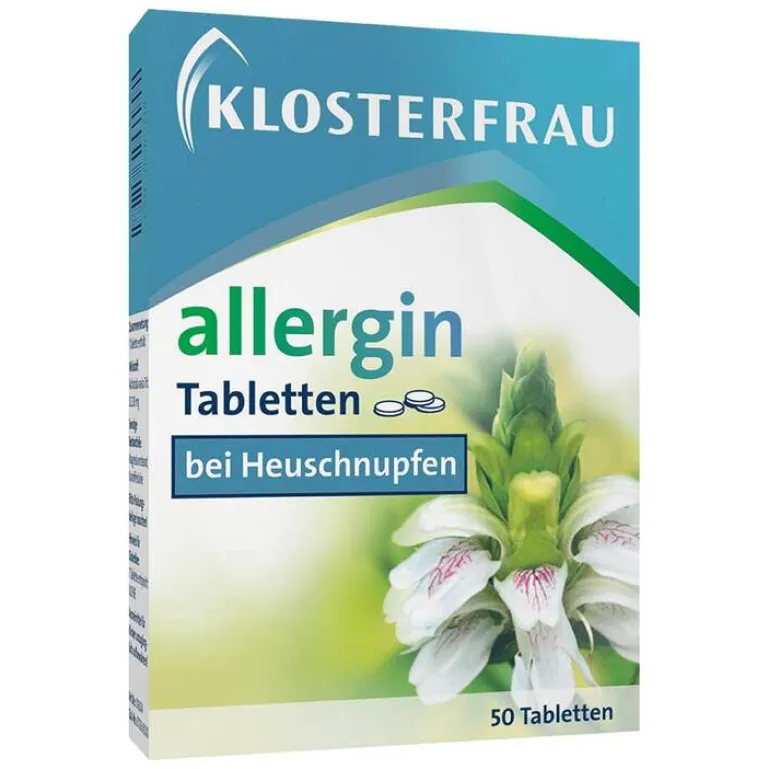 Klosterfrau® allergin Tabletten. Wirkstoff: Adhatoda vasica Trit. D2. Anwendungsgebiete: Klosterfrau® allergin Tabletten werden entsprechend dem homöopathischen Arzneimittelbild angewendet. Dazu gehören: Besserung der Beschwerden bei Heuschnupfen. Hinweis: Wenn der Heuschnupfen länger andauert, sollte, wie bei allen unklaren Beschwerden, ein Arzt aufgesucht werden, da es sich um Erkrankungen handeln kann, die einer ärztlichen Behandlung bedürfen. Warnhinweise: Enthält Lactose. Packungsbeilage beachten. Zu Risiken und Nebenwirkungen lesen Sie die Packungsbeilage und fragen Sie Ihre Ärztin, Ihren Arzt oder in Ihrer Apotheke.
