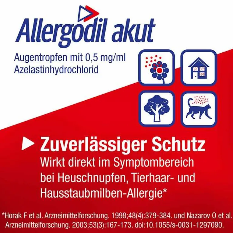 Allergodil® akut Augentropfen. 0,5 mg/ml, Augentropfen, Lösung. Wirkstoff: Azelastinhydrochlorid. Anwendungsgebiet: Behandlung u. Vorbeugung von durch Heuschnupfen bedingten Beschwerden am Auge (saisonale allergische Konjunktivitis) bei Erwachsenen u. Kindern ab 4 Jahren. Behandlung von durch Allergien auf Substanzen wie zum Beispiel Hausstaubmilben u. Tierhaare bedingten Beschwerden am Auge (nicht-saisonale (perenniale) allergische Konjunktivitis) bei Erwachsenen u. Kindern ab 12 Jahren. Warnhinweis: Enthält Benzalkoniumchlorid. Packungsbeilage beachten. Stand:12.2022 Apothekenpflichtig Viatris Healthcare GmbH, Lütticher Straße 5, 53842 Troisdorf Zu Risiken und Nebenwirkungen lesen Sie die Packungsbeilage und fragen Sie Ihre Ärztin, Ihren Arzt oder in Ihrer Apotheke