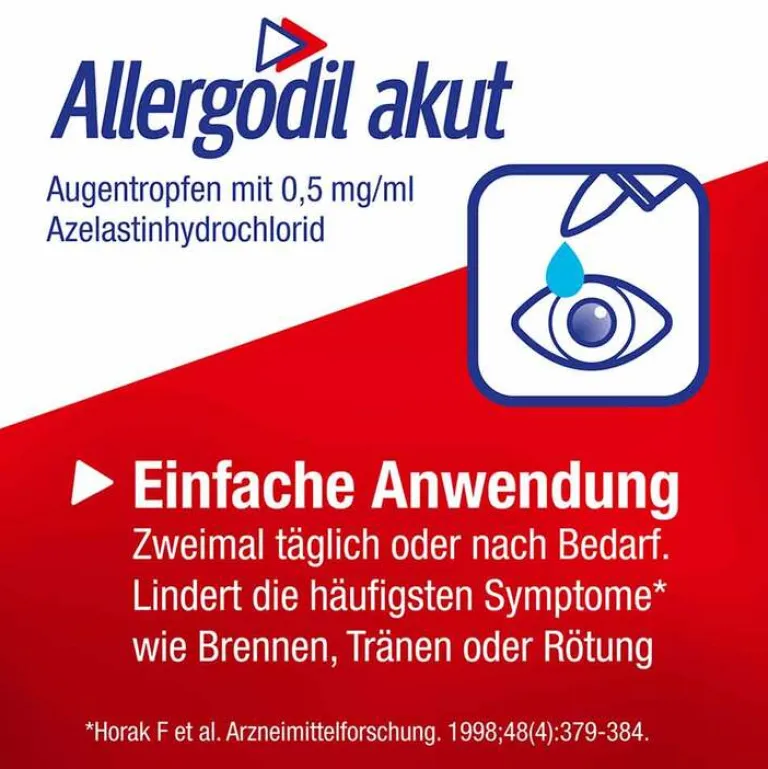 - Symptomlinderung: Brennende, rote, juckende sowie tränende Augen infolge einer Allergie können durch Allergodil® akut Augentropfen gelindert werden. Dafür 2x täglich jeweils einen Tropfen in jedes Auge