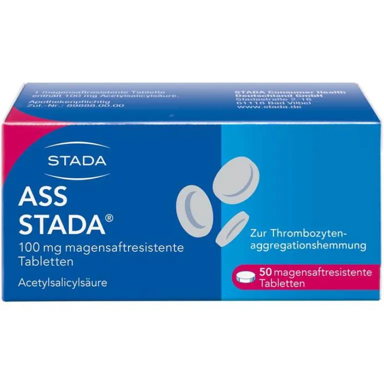 ASS STADA® 100 mg magensaftresistente Tabletten Wirkstoff: Acetylsalicylsäure. Wird angewendet, um das Risiko der Entstehung von Blutgerinnseln zu verringern und damit folgenden Erkrankungen vorzubeugen: weitere Herzinfarkte, weitere vorübergehende Mangeldurchblutung im Gehirn (TIA: transitorisch ischämische Attacke) oder weitere Schlaganfälle, vorausgesetzt Hirnblutungen wurden ausgeschlossen, Probleme des Herz-Kreislauf-Systems bei Patienten mit stabiler oder instabiler Angina pectoris (Schmerzen im Brustbereich). Wird ebenfalls angewendet, um der Entstehung von Blutgerinnseln nach bestimmten Arten von herzchirurgischen Eingriffen zur Erweiterung oder zum Offenhalten der Blutgefäße vorzubeugen. Dieses Arzneimittel eignet sich nicht für Notfallsituationen. Es kann nur zur Vorbeugung eingenommen werden. Zu Risiken und Nebenwirkungen lesen Sie die Packungsbeilage und fragen Sie Ihre Ärztin, Ihren Arzt oder in Ihrer Apotheke. STADA Consumer Health Deutschland GmbH, Stadastraße 2-18, 61118 Bad Vilbel Stand: März 2025