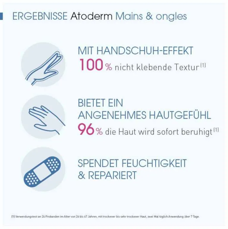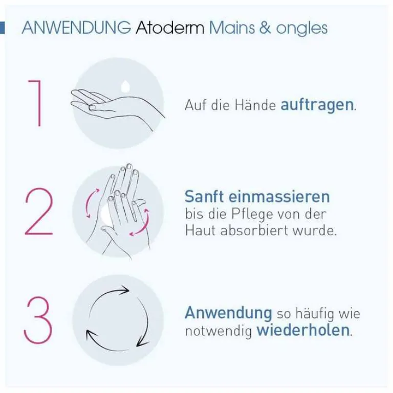 Die schnell einziehende Hand-und Nagelcreme Atoderm Mains Handcreme und beruhigt trockene und raue Hände und Fingernägel ohne zu fetten. Sie ist ideal für die Anwendung nach häufiger Händedesinfektion.