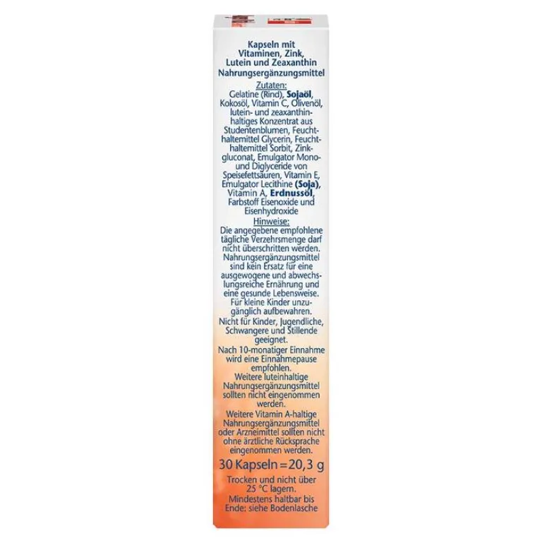 Sojaöl, Gelatine (Rind), L-Ascorbinsäure, Sojaöl (teilweise gehärtet), Olivenöl, Feuchthaltemittel Glycerin, lutein- und zeaxanthinhaltiges Konzentrat aus Studentenblumen, DL-alpha-Tocopherol, Stabilisator Bienenwachs gelb, Zinkgluconat, Emulgator Sojalecithine, Feuchthaltemittel Sorbit, Retinylpalmitat, Farbstoff Eisenoxide und Eisenhydroxide