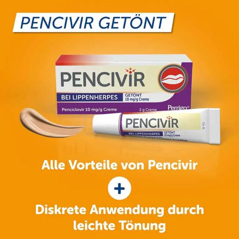 Pencivir bei Lippenherpes 10 mg/g Creme (Wirkstoff: Penciclovir).. Wirkstoff: 10 mg Penciclovir in 1 g Creme. Sonstige Bestandteile: Propylenglycol; gereinigtes Wasser; weißes Vaselin; Cetylstearylalkohol; dickflüssiges Paraffin; Cetomacrogol 1000. Anwendungsgebiet: Zur lindernden Therapie von Schmerzen und Juckreiz sowie zur Beschleunigung der Krustenbildung beim natürlichen Heilungsverlauf von akuten Episoden leichter Formen wiederholt auftretender Lippenbläschen (rezidivierender Herpes labialis). Zu Risiken und Nebenwirkungen lesen Sie die Packungsbeilage und fragen Sie Ihre Ärztin, Ihren Arzt oder in Ihrer Apotheke. Gegenanzeigen: Überempfindlichkeit gegen die Wirkstoffe Penciclovir, Famciclovir, Aciclovir oder einen der sonstigen Bestandteile. Nicht auf Schleimhäuten (z. B. in Augen, Mund, Nase oder den Genitalien) oder in der Nähe des Auges anwenden. Nicht bei immunsupprimierten Patienten oder Kindern unter 12 Jahren anwenden. In Schwangerschaft und Stillzeit nur unter Aufsicht eines Arztes und nur nach sorgfältiger Nutzen-Risiko-Abwägung anwenden. Nebenwirkungen: Häufig: Reaktionen an den behandelten Hautabschnitten (einschließlich Brennen und Schmerzen auf der Haut, Taubheitsgefühl). Häufigkeit nicht bekannt: Überempfindlichkeitsreaktionen, Urtikaria. Allergische Dermatitis (einschließlich Ausschlag, Pruritus, Bläschen und Ödeme). Warnhinweis: Enthält Cetylstearylalkohol und Propylenglycol. Perrigo Deutschland GmbH, Königstraße 26, DE-70173 Stuttgart