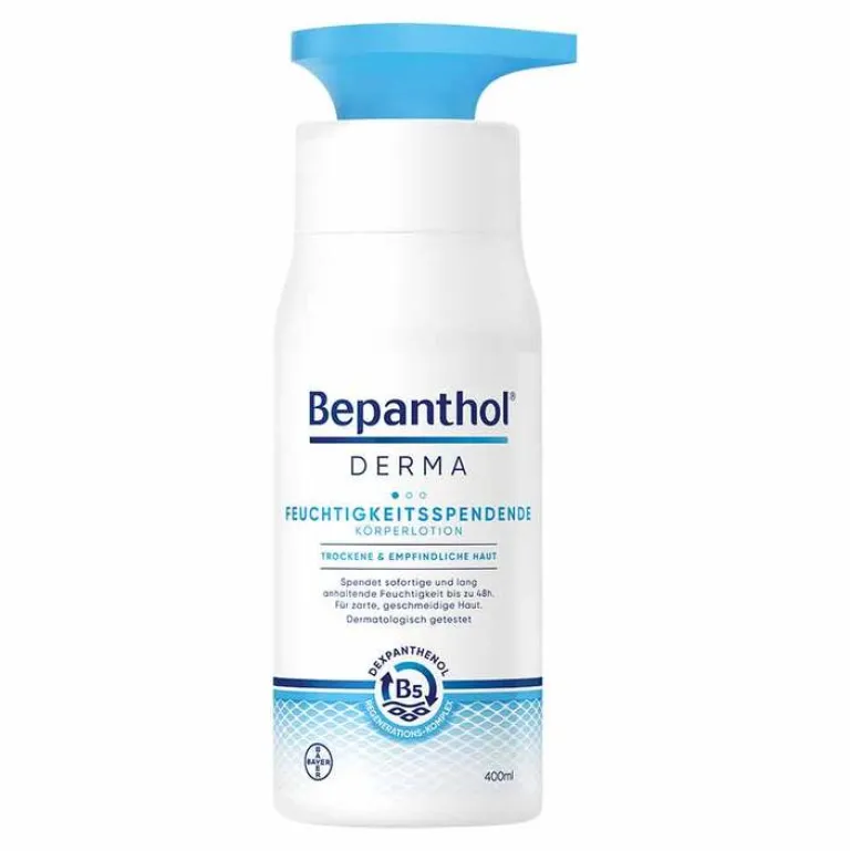 Die Bepanthol Derma feuchtigkeitsspendende Körperlotion ist leicht, klebt nicht und zieht schnell ein. Ihre Haut wird sofort und lang anhaltend (bis zu 48 h) mit Feuchtigkeit versorgt. Nach dem Eincremen fühlt sich sie sich sofort zart und geschmeidig an. Die Körperlotion ist perfekt geeignet für empfindliche und extrem trockene Haut. Sie beruhigt sie sofort und lindert Spannungsgefühle.