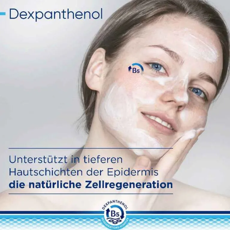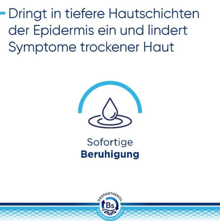 Der B5-Regenerations-Komplex unterstützt die Regeneration der Haut– von innen nach außen. Dabei fördert Dexpanthenol in tieferen Hautschichten der Epidermis die natürliche Zellregeneration. Das enthaltene Glycerin spendet sofortige und lang anhaltende Feuchtigkeit. Niacinamid (Vitamin B3) beruhigt juckende, trockene Haut und Arganöl ergänzt fehlende Hautlipide. Das physiologische Lipid unterstützt zusätzlich die Anordnung der Doppellipidschicht.